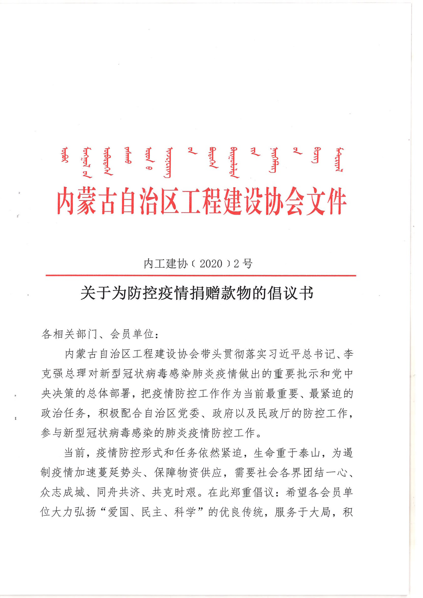 六、2月10日發(fā)出內(nèi)蒙古自治區(qū)工程建設(shè)協(xié)會《關(guān)于為防控疫情捐贈款物的倡議書》。