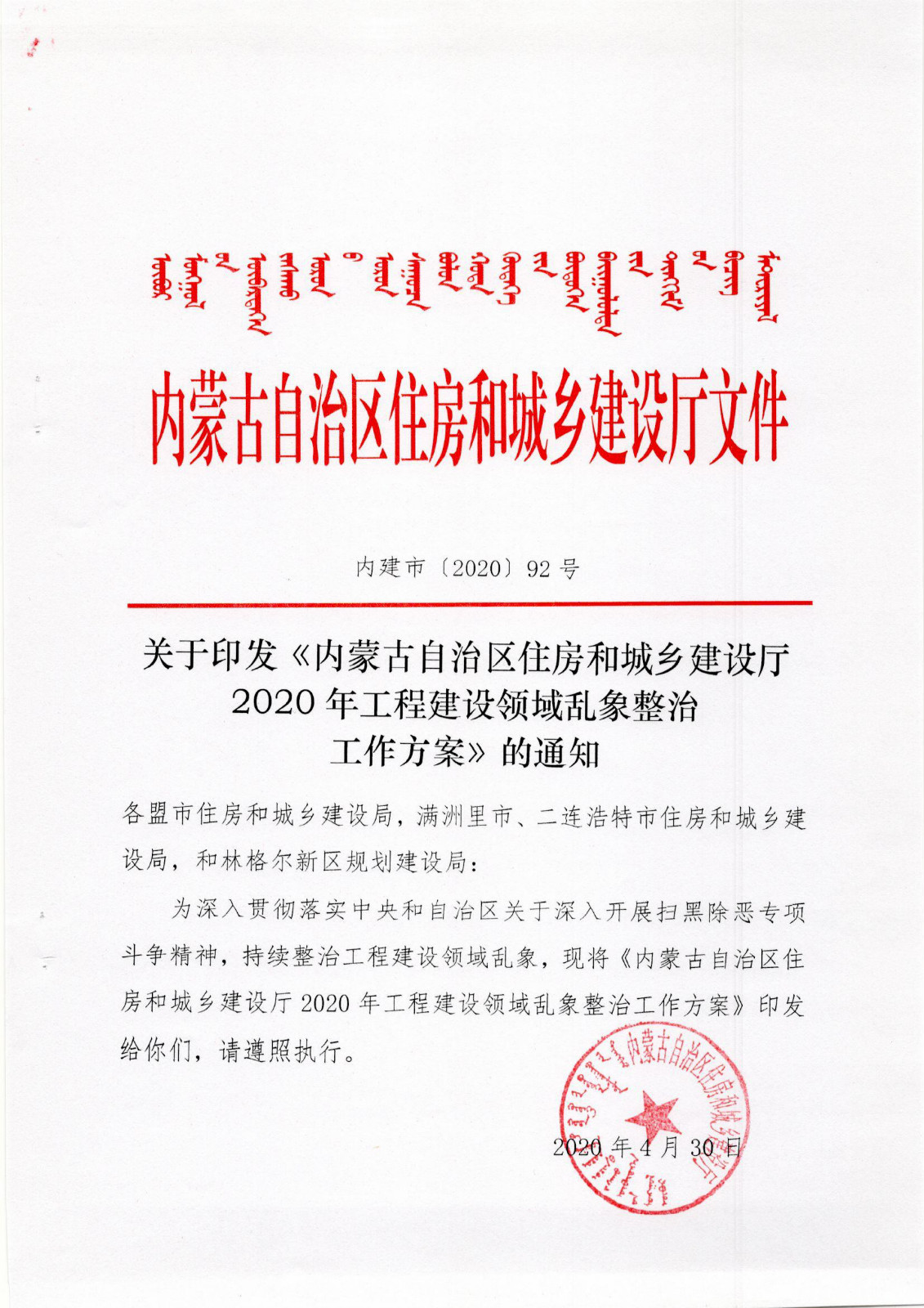 關(guān)于印發(fā)《內(nèi)蒙古自治區(qū)住房和城鄉(xiāng)建設(shè)廳2020年工程建設(shè)領(lǐng)域亂象整治工作方案》的通知