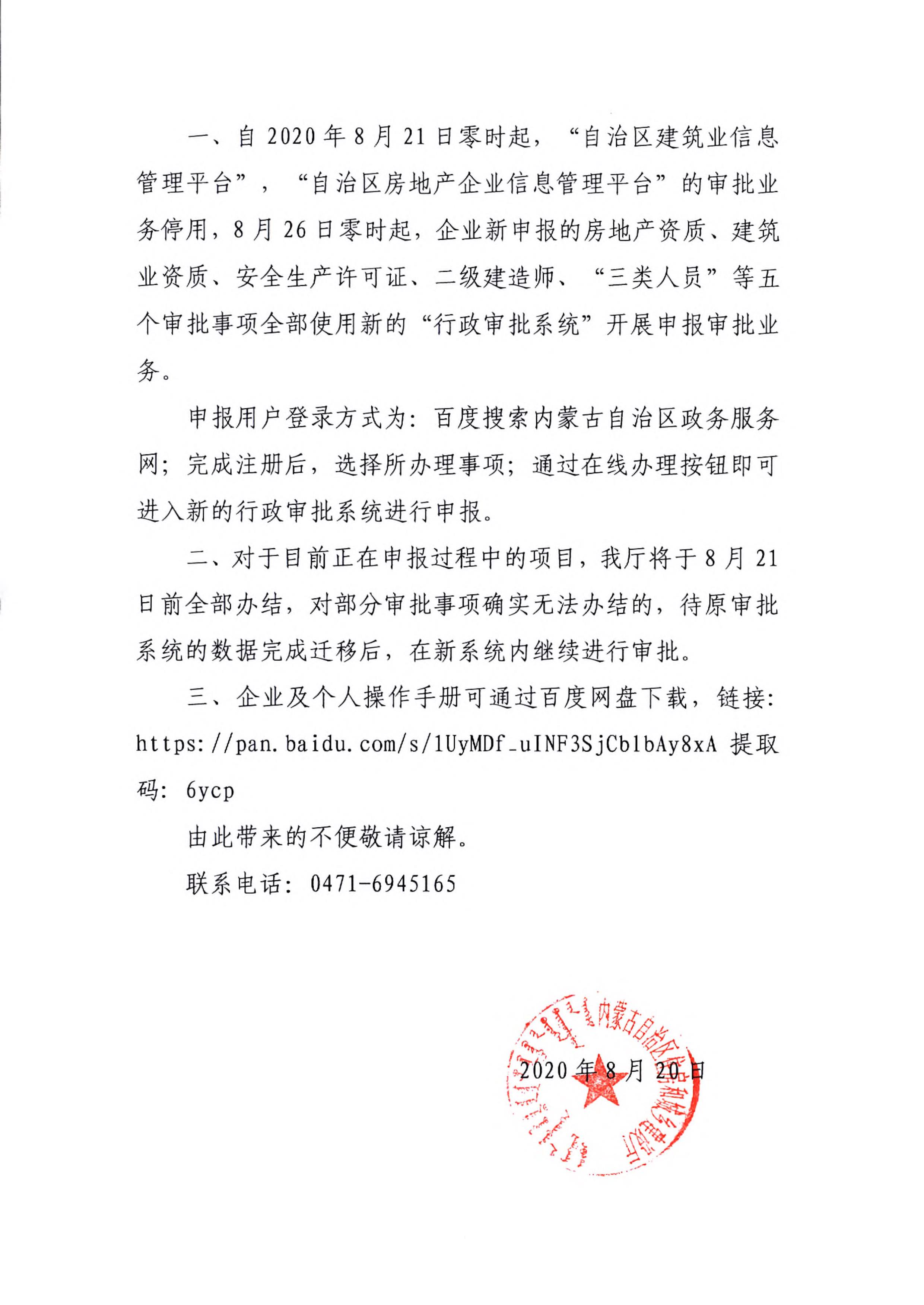 內蒙古自治區(qū)住房和城鄉(xiāng)建設廳關于停用“自治區(qū)建筑業(yè)信息管理平臺”“自治區(qū)房地產企業(yè)信息管理平臺”審批業(yè)務啟用新的“行政審批系統(tǒng)”的公告